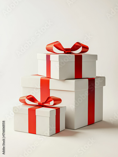 Three elegantly stacked white gift boxes adorned with vibrant red ribbons, creating a festive atmosphere for holiday celebrations