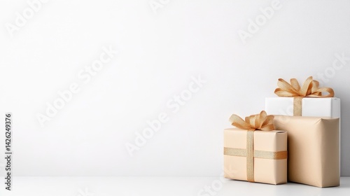 Three elegantly wrapped gift boxes with ribbons on a minimalist white background, showcasing a clean and simple composition, and perfect for holiday or celebration concepts.