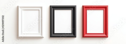 Three empty picture frames in white, black, and red against a neutral background, ideal for displaying artwork or photographs, adding a modern touch to any decor.