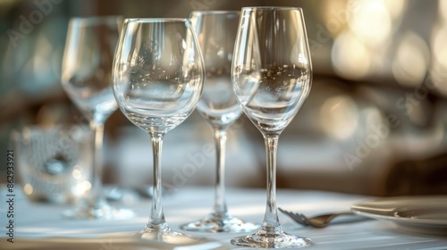 blurry, close, warm, arrangement, shiny, life, clear, crystal, wine, background, sharpened, place, white, eatery, setting, stemware, empty, silverware, formal, soft, course, table, gold, up, dinner, composition, plate, glassware, cutlery, tablecloth, sharp, fork, glasses, shadow, elegant, clean, still, light, dining