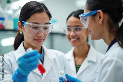Three Female Scientists Collaborating in a Modern Laboratory Setting, Ideal for STEM Education and Inspirational Posters