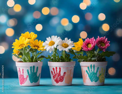 Three flower pots with colorful handprints, flowers in the pots, a blue background with lights and a bokeh effect, colorful daisies, and yellow chrysanthemums on top of each plant (1)