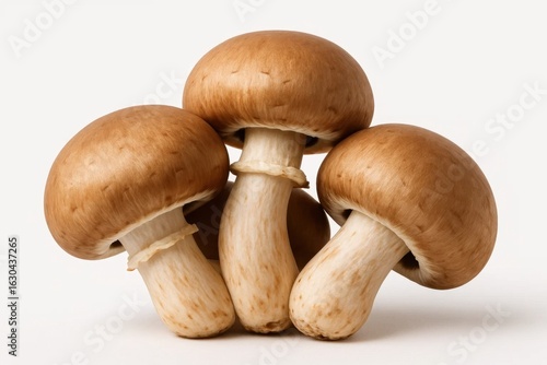 Three fresh mushrooms with a light brown cap and white stem, stacked on top of each other against a white background
