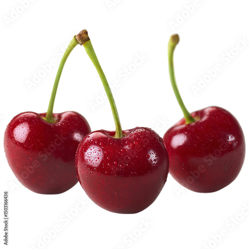 Three fresh, vibrant cherries glistening. They are a deep red color with water droplets, attached by green stems