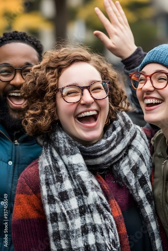 friends, smiling, winter, cold, happy, group, people, outside, laughing, joyful, casual attire, fun, woman, man, female, male, black, white, caucasian, goggles, foulard, hat, jacket, urban, portrait, street, photo, lifestyle, friendship