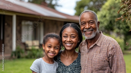 family, generation, portrait, love, smiling, home, happiness, bonding, relative, together, bond, oneness, three, front, yard, house, value, joyful, cheerful, photo, warm, emotional, standing, precious, moment