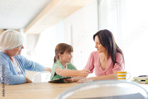 three, generation, woman, use, tablet, computer, adult, bend, bonding, children, clothes, curious, daughter, dining, domestic, elementary, enjoy, family, girl, granddaughter, grandmother, guidance, happy, head shot, indoor, cyberspace, laptop, learn, leisure, lifestyle, low angle, mother, people, read, room, senior, share, silver, smile, surfer, table, technology, togetherness, view, wireless