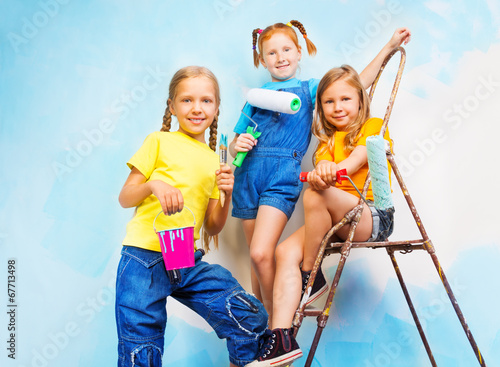 children, children, children, children, three, three, girl, girl, lifestyle, to sit, sit, sitting, rust, racked, stand, standing, holding, roller, brush, brush, smiling, smile, toothy, colours, yellow, jean, hair, blond, ginger, pattern, painting, bun, bun, tail, ponytail, purple, bucket, pail, pretty, nice, young, little, bright, caucasian, renovation, paint, ladder, happy, high-coloured