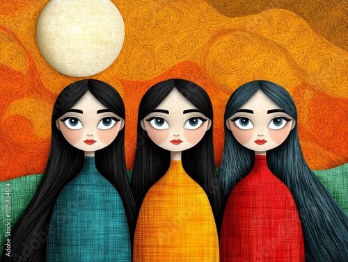 girl, illustration, autumn, fall, friendship, sisterhood, oneness, togetherness, portrait, woman, female, long hair, teal, orange, red, textured, fabric, art, artwork, painting, digital artwork, graphic, design, style, whimsical, cute, adorable, pretty, beautiful, happy, autumn color, three sisters