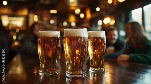 Three Glasses of Beer on Table in a Cozy Bar Setting, Perfect for Social Gatherings and Celebrations