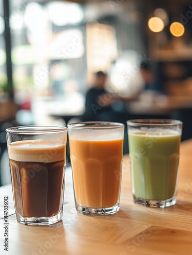 Three glasses of different tea drinks on oak table in coffee shop, blurred background with bokeh effect, featuring black coffee, orange juice, and green milk tea