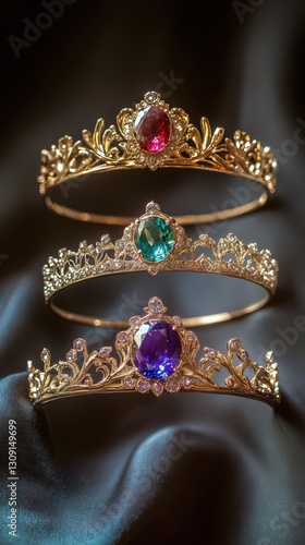Three Gold Tiaras Adorned With Gemstones