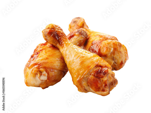 Three golden brown roasted chicken drumsticks piled together on a black background cooked food, Isolated, Png Transparent Background