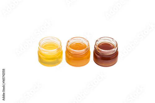 honey, jar, glasses, three, yellow, orange, brown, bee, flower, semitransparent, fresh, natural, sweetener, various, assortment, food, nourishment, ingredient, product, nectar, sirup, dessert, sweet, tasty, health, ecological, bio, summer, isolated, white, background