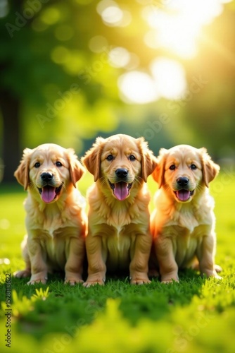 Three golden retriever pups, sunny park, summer fun, daytime, puppy