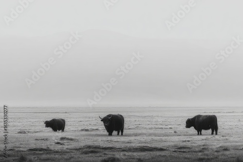 cattle, highland, animal, misty, monochrome, landscape, black-and-white, silhouette, rural, foggy, plain, farmland, wildlife, nature, exterior, still, horizontal, grey, white, brown, standing, grazing, peaceful, calm, empty, wide, open, horizon, distant, cold, mist, fog, mammal, bovine, scottish, solitude, serene, view, photo, image, photo