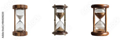 Three hourglasses with wooden and brass frames showing sand flow isolated on a transparent background