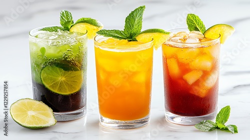 iced tea, lime, mint, drink, beverage, refreshment, summer, cocktail, ice, goggles, marble, background, closeup, photo, food photography, citrous, herb, carbonated, fizzy, refreshing, cool, delicious, tasty, vibrant, colourful, bright, texture, detailed, high-quality, studio shot, culinary, gastronomy