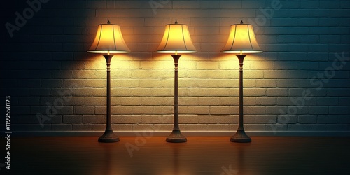 lamp, floor, lighting, illuminated, interior, design, home, decor, warm, light, brick, wall, room, elegant, classic, style, vintage, modern, aesthetic, ambience, cosy, comfort, bright, shadow, texture, arrangement, symmetric, three, set, collection, furniture, household, object, still, life, dark, night, evening, glow, gold, wooden