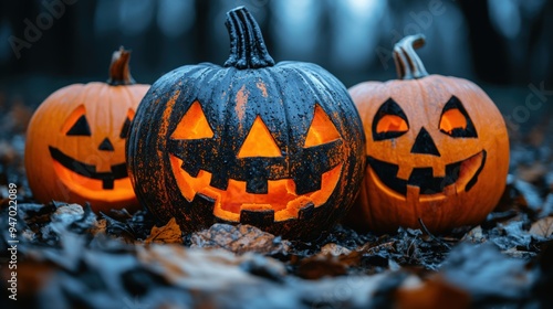 Three intricately carved jack-o'-lanterns with glowing faces placed on fallen autumn leaves creating a spooky Halloween ambiance in a dimly lit forest