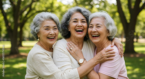 Three Joyful Senior Women Laughing Together Embracing in a Park Setting