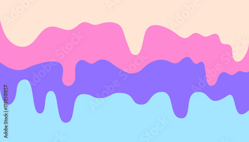 Three layers of pastel colored candy or ice cream drip. Sweet dessert border with melted flowing icing. Cream, pink and blue liquid glaze
