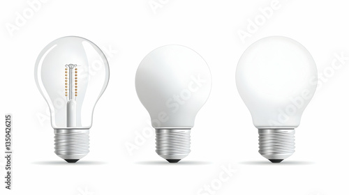 Three LED light bulbs, different styles, white background, energy efficiency concept, website, or product catalog