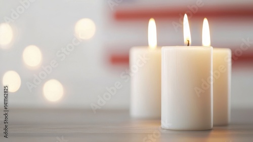 Three lit white candles create a warm, serene atmosphere, softly glowing against a blurred background, evoking a sense of peace.