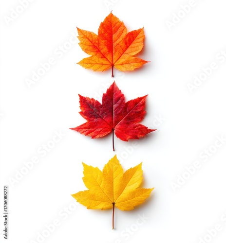 Three maple leaves, vibrant orange, red and yellow, are arranged vertically on a white background. Shadows suggest natural light