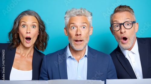Three men and a woman are sitting together and looking surprised. They are all wearing suits and ties