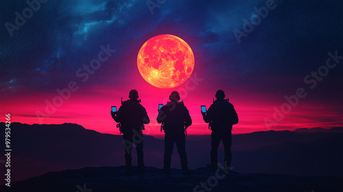 Three men are standing on a hill, looking at a red moon