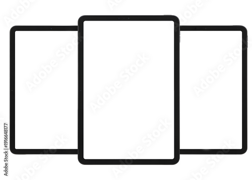 Three modern digital tablets displaying blank screens, arranged side by side, isolated on transparent background