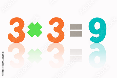 Three multiply three equals nine (3x3=9) Image of simple math addition operation for kids math operation to enhance brain skills. (Plus, minus, multiply, divide) Isolated on white background.