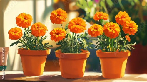flower, plant, orange, pot, bloom, blossom, floral, nature, flower petals, garden, botany, green, leaf, stem, arrangement, vase, colours, vibrant, bright, sunlight, detail, close, up, summer, beauty, natural, fresh, growth, life, decorative, indoor, window sill, container, background, still, composition, daylight, flora, cultivation, home, spring, tender, delicate, artwork, illustration, painted, art