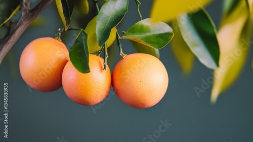 Three oranges hanging from a tree branch. The oranges are ripe and ready to be picked. The leaves on the tree are green and healthy