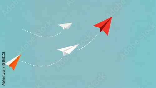 Three paper planes flying, one leading with a different color and path against a blue background.