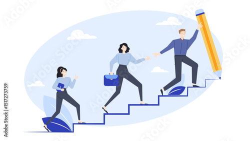 Three people climbing staircase with pencildrawn blue steps. Ideal for illustrating teamwork, progress, creativity, and reaching goals concepts.