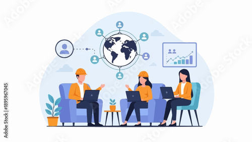 collaboration, team, technology, meeting, communication, global, connection, teamwork, discussion, project, planning, strategy, business, office, professional, men at work, digital, network, people, laptop, computer, datum, analysis, presentation, growth, success, progress, earth, earth, planet, individual, figure, chart, graph, statistic, icon, design, illustration, graphic, modern, flat, conceptual, remote, work, workflow, idea