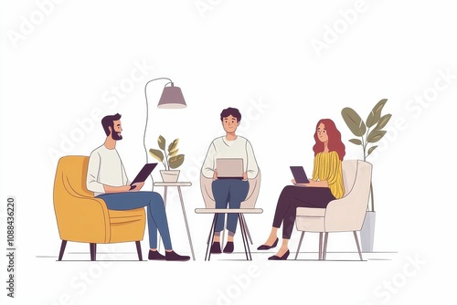 Three people work together on devices in chairs.
