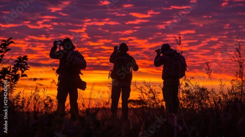 Three photographers stand silhouetted against a spectacular sunset, holding cameras and focused on the dramatic colorful sky filled with clouds, as twilight envelops the landscape.