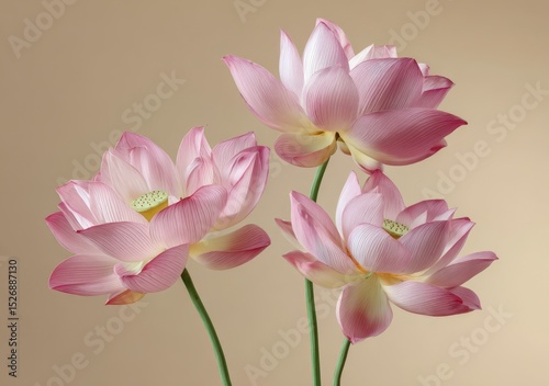 Three pink lotus flowers bloom against a beige background. Floral beauty, nature, serenity, elegance, growth.
