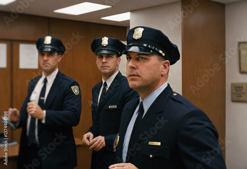 police, officer, uniform, man, law, enforcement, authority, professional, official, security, safety, service, group, people, indoor, portrait, formal, attire, hat, cap, badge, attaching, suit, serious, focused, watchful, vigilant, duty, responsibility, public, protection, department, agency, government, justice, order, standing, looking, pose, scene