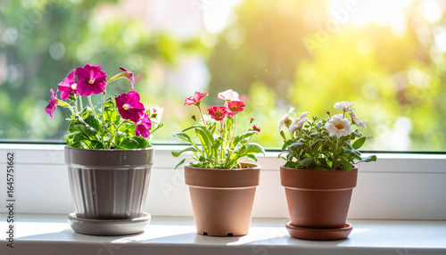 three potted plants are arranged on a windowsill against a bright, sunlit background