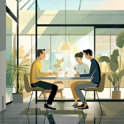 Three professionals having a business meeting in a modern office with large windows and indoor plants, discussing and reviewing documents.
