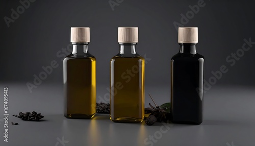 Three rectangular glass bottles filled with different colored oils, showcasing a neutral backdrop and natural wood-toned caps.