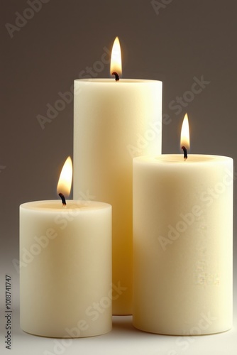 Three simple, soft-glowing candles grouped together, providing a tranquil, minimalist composition against a neutral background.