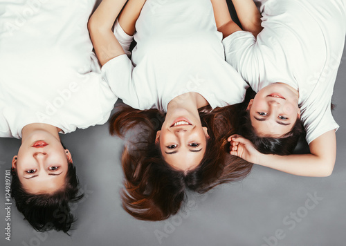 fashion, portrait, closeup, shirt, fun, white, bonding, happiness, friendship, sister, casual clothes, people, female, love, family, woman, togetherness, lifestyle, sibling, up high, femininity, joy, looking, teenage, enjoyment, cheerful, beautiful, relaxation, upside down, lying down, missy, black hair, straight hair, studio shot, three people, looking up, young adult, long hair