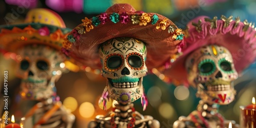 Three skeletons wearing sombreros and painted faces are standing next to each other. Scene is festive and celebratory, as the skeletons are dressed up for a Mexican holiday