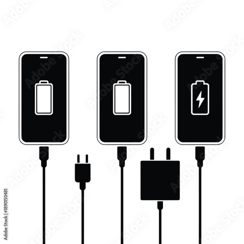 phone, battery, battery, charging, charge, power, energy, icon, icon, graphic, illustration, vector, black, white, minimalist, design, technology, digital, device, portable, cable, plug, adapter, usb, outlet, wall, mains outlet, electricity, electronic, connection, level, full, empty, half, indicator, progress, status, modern, contemporary, simple, flat, outline, symbol, representation, communication, mobile, screen