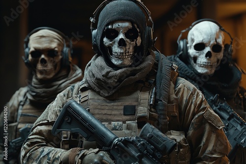 Three soldiers ready for conflict with skull masks and tactical gear in a photorealistic setting